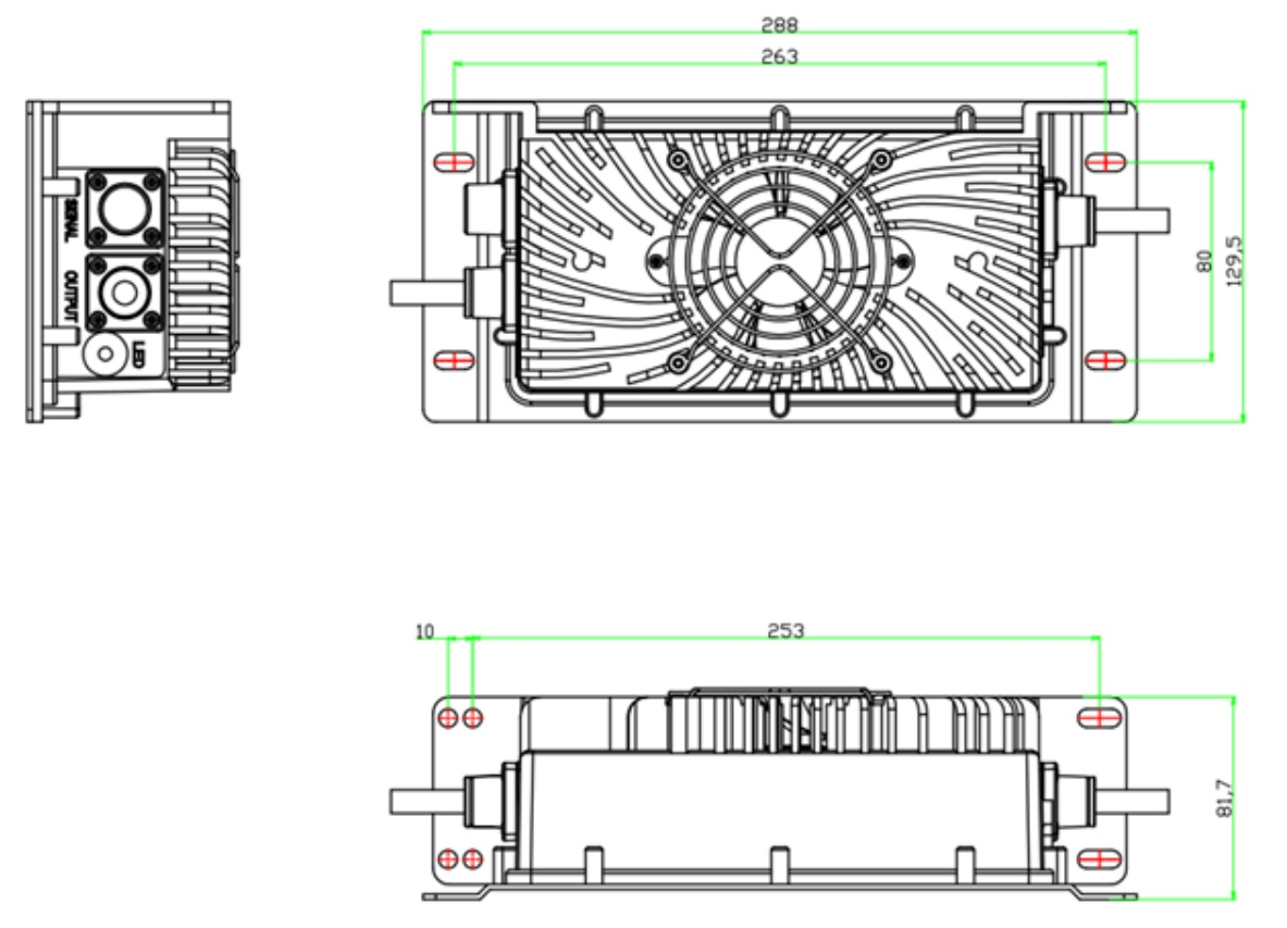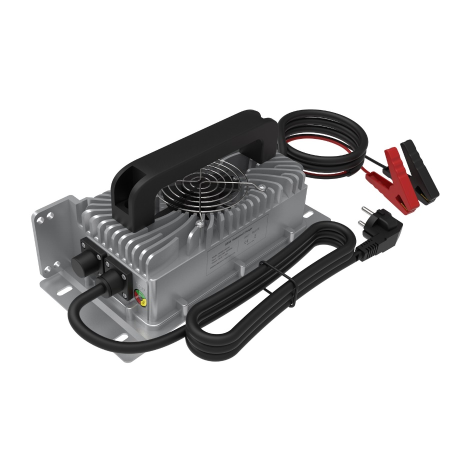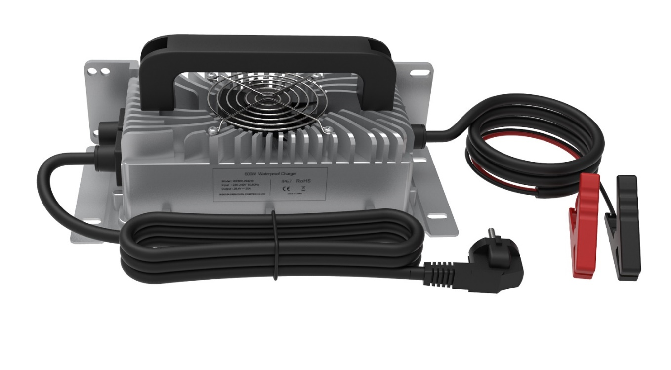 WP800-xy is a single output waterproof type battery charger with 4 and 3 stage charging curve. In addition to the embedded pre-defined charging curves, the default curve is programmable and thus able to accommodate different types of batteries, such as Lead- acid batteries (Gel, flooded and AGM) and Lithium batteries (Li-ion, LiFePO4 and Lithium manganese). WP800 can be set different charging voltage value, charging current value and charging end current value through CAN port, according to customer's upper device. This charge has IP68 waterproof protection level.