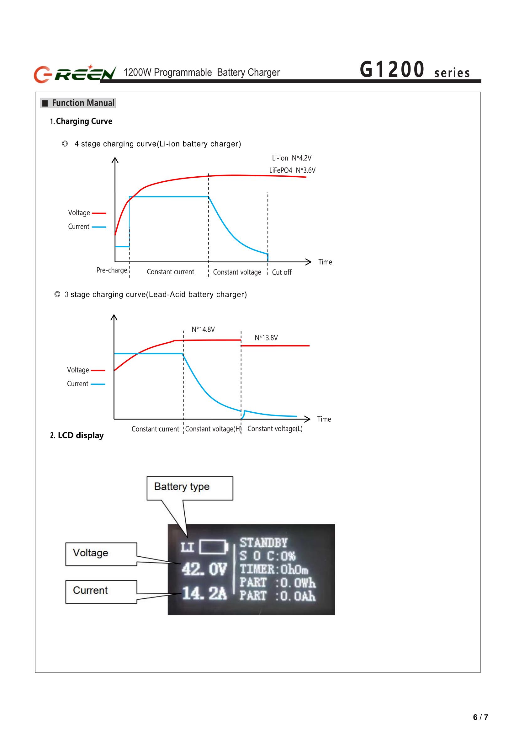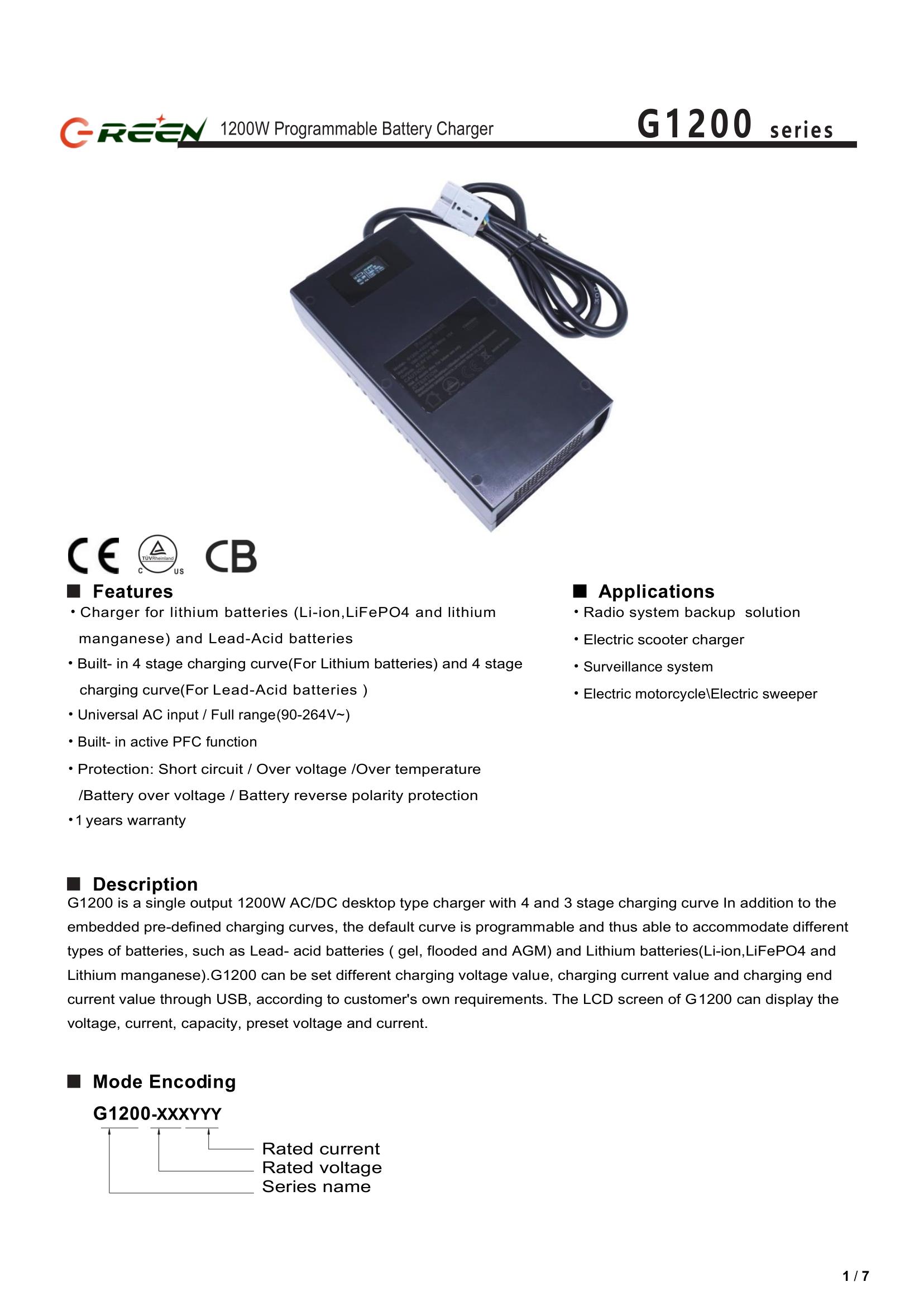 G1200 is a single output 1200 W AC/DC desktop type charger with 4 and 3 stage charging curve In addition to the embedded pre-defined charging curves,the default curve is programmable and thus able to accommodate different types of batteries,such as Lead- acid batteries ( SLA, VRLA, GEL, AGM) and Lithium batteries(Li-ion,LiFePO4 and Lithium manganese). G1200 can be set different charging voltage value, charging current value and charging end current value through USB, according to customer's own requirements. The LCD screen of G1200 can display the voltage, current,capacity, and preset voltage and current.