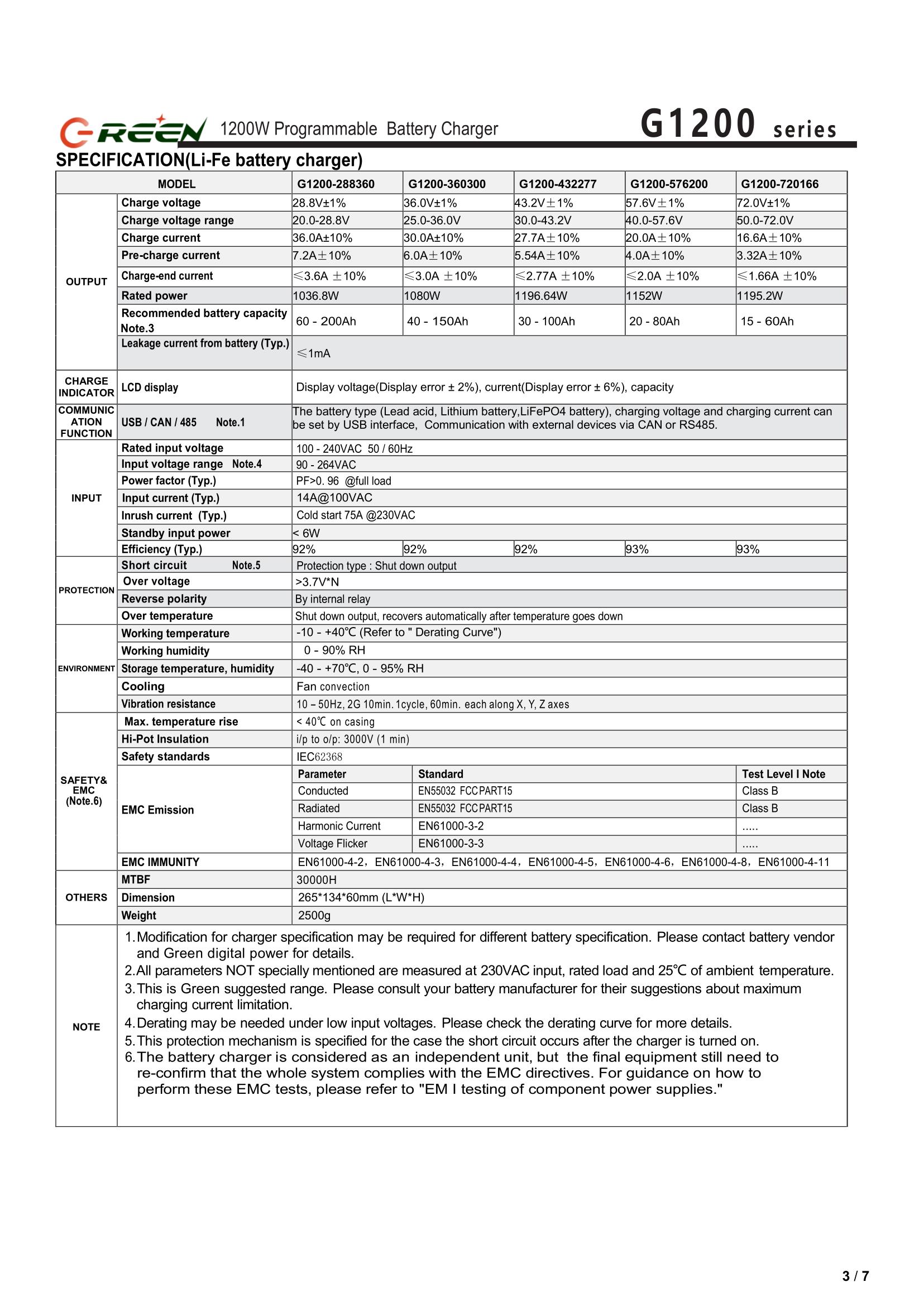 | G1200-288360 | 28.8V +-1% | 36A +-7% | 3.6A +-0.4A | 8S LIFEPO4, 36~360Ah |