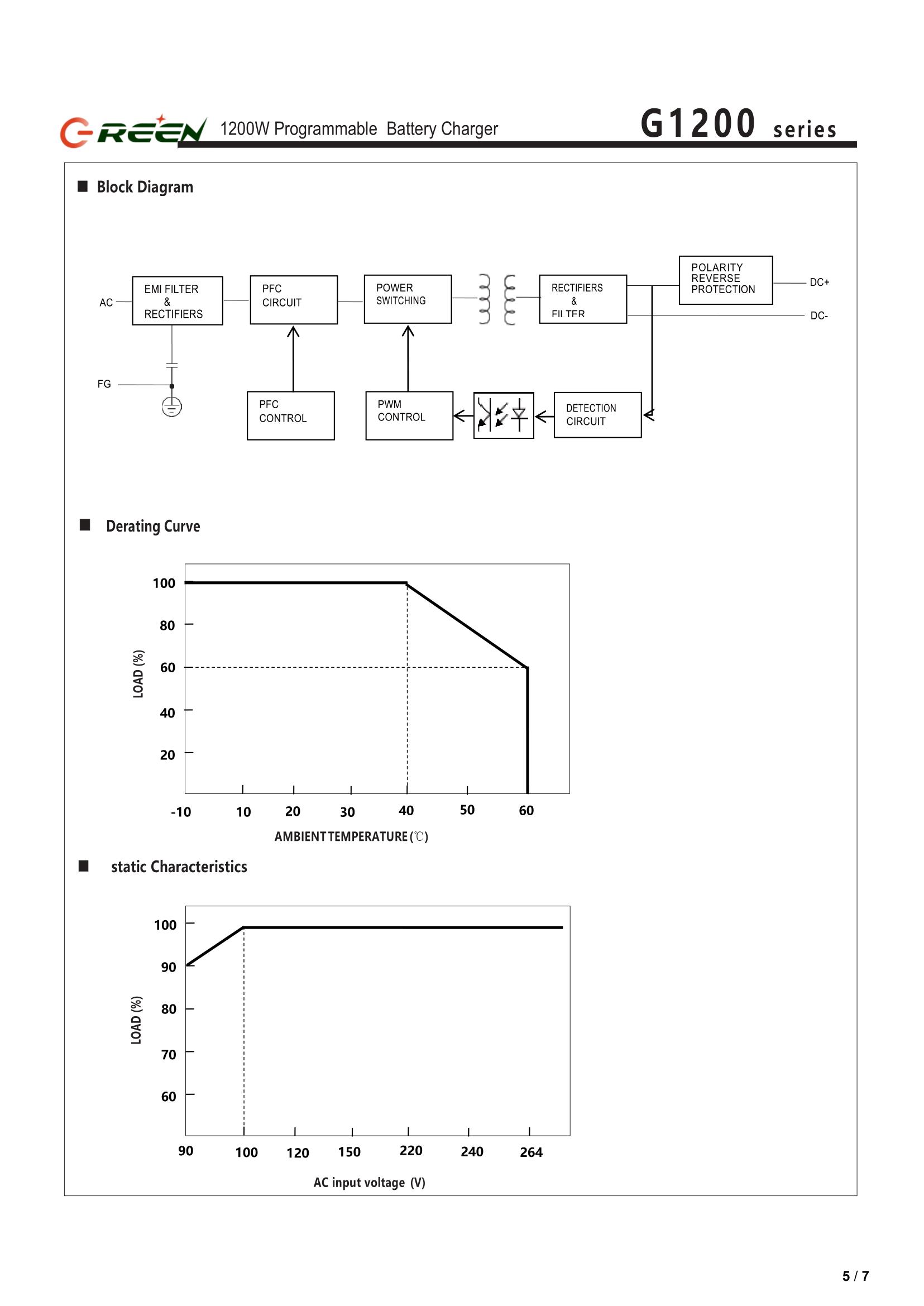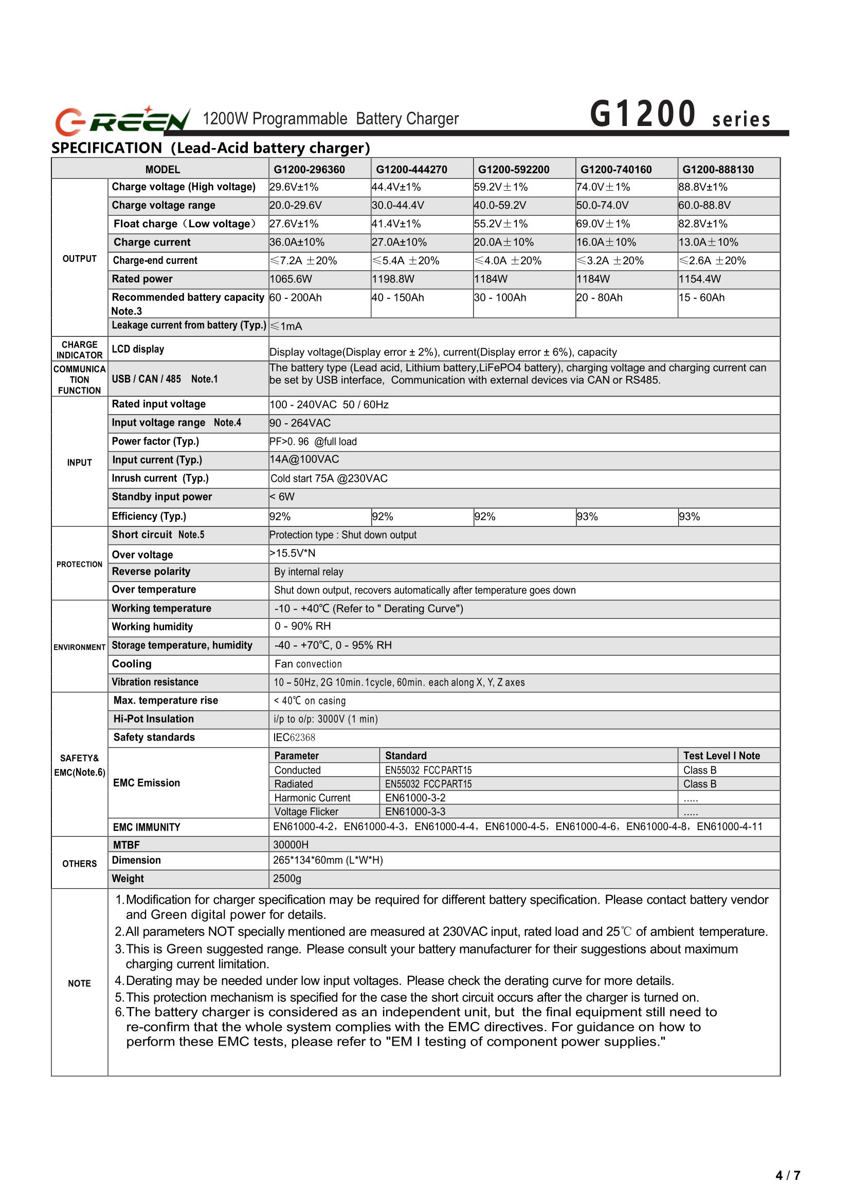 | G1200-294360 | 29.4V +-1% | 36A +-7% | 27.6V +-1% | 24V 150~ 450Ah |
