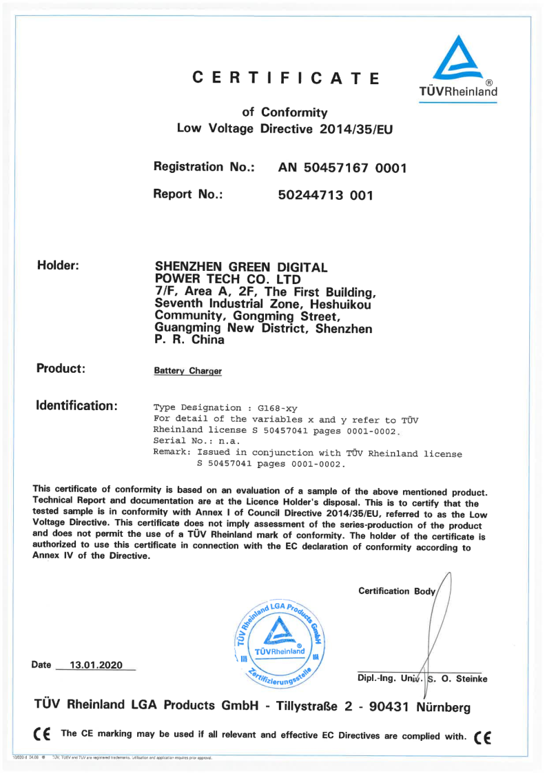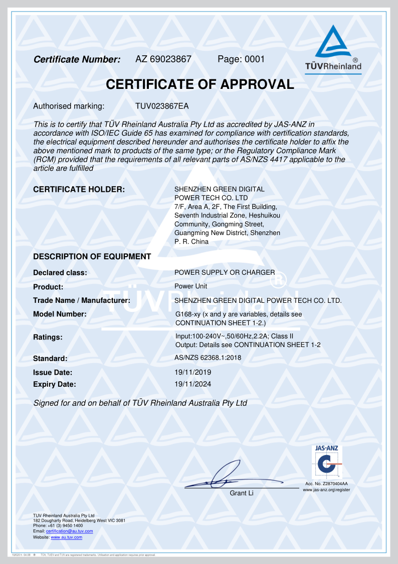 Safety certification: CB CE FCC cTUVus CCC PSE GS KC