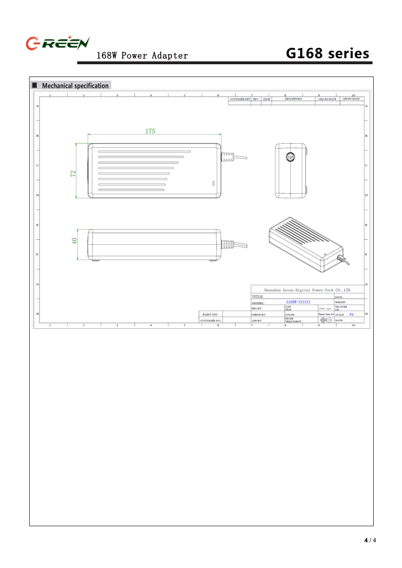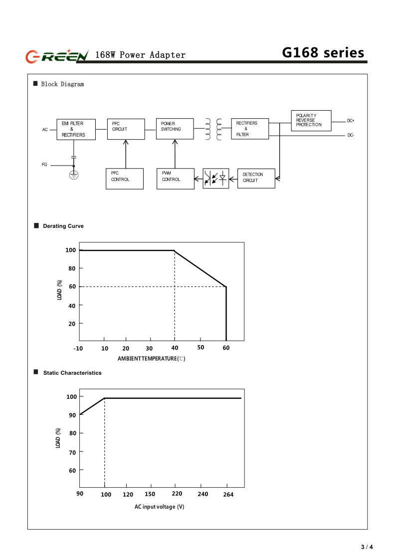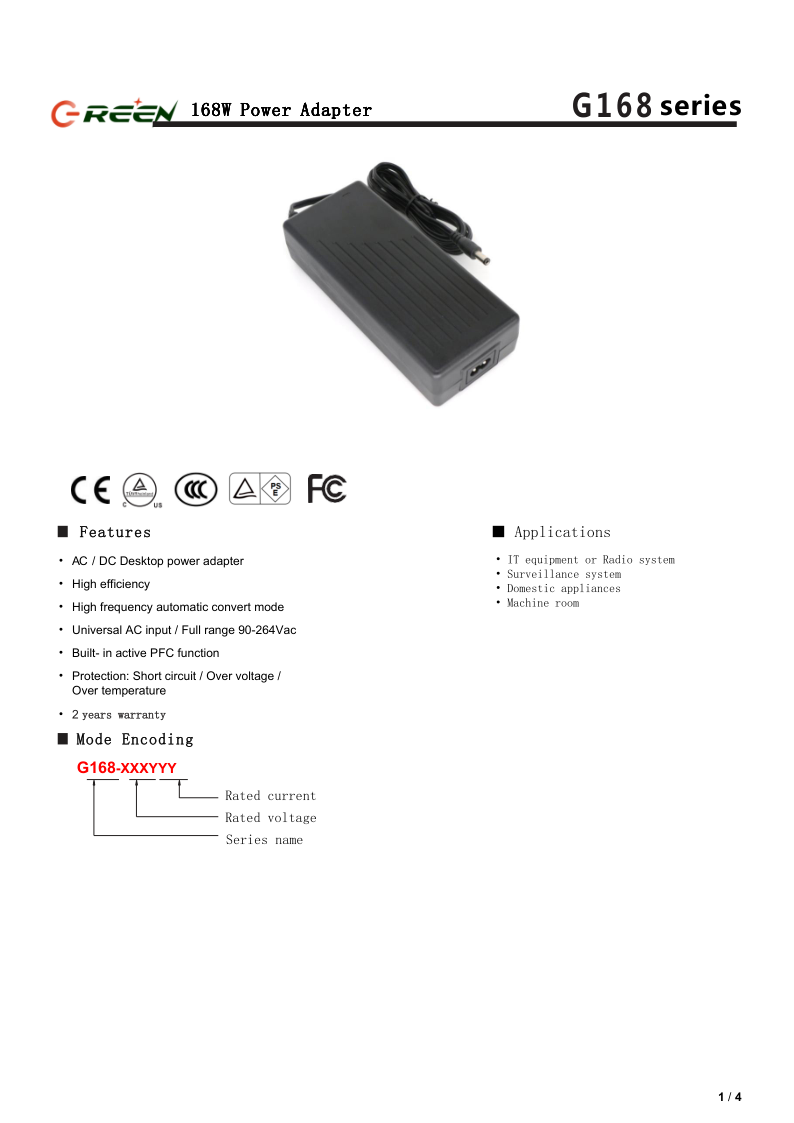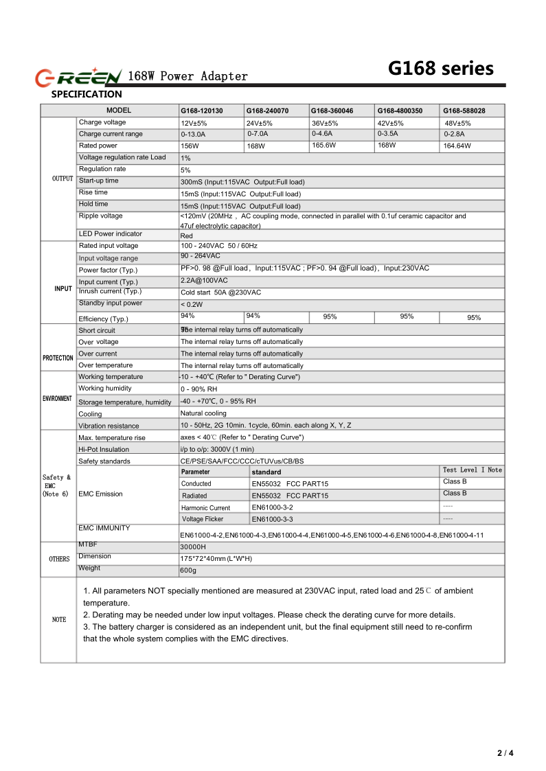 G168-xy 168W power adapter is a high-performance and highly reliable product. Its input voltage range is 100~240Vac, which can meet the voltage standards of various countries and regions. Output power is 168W, output voltage is 12V~60V, defined in below P/N parameters table. Power factor is as high as 0.98, and its efficiency reaches 95.0%. at 220V input full load condition. It also features low standby power consumption and low leakage current, making it a very environmentally friendly power adapter.