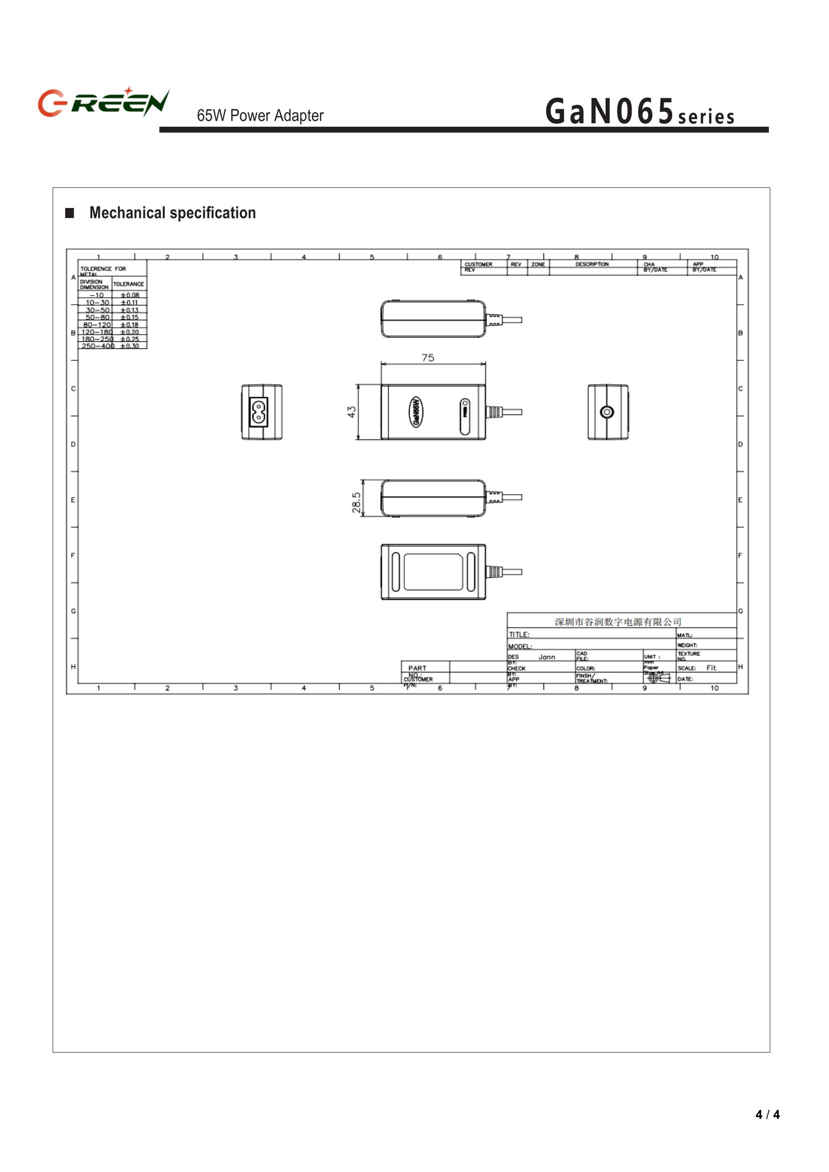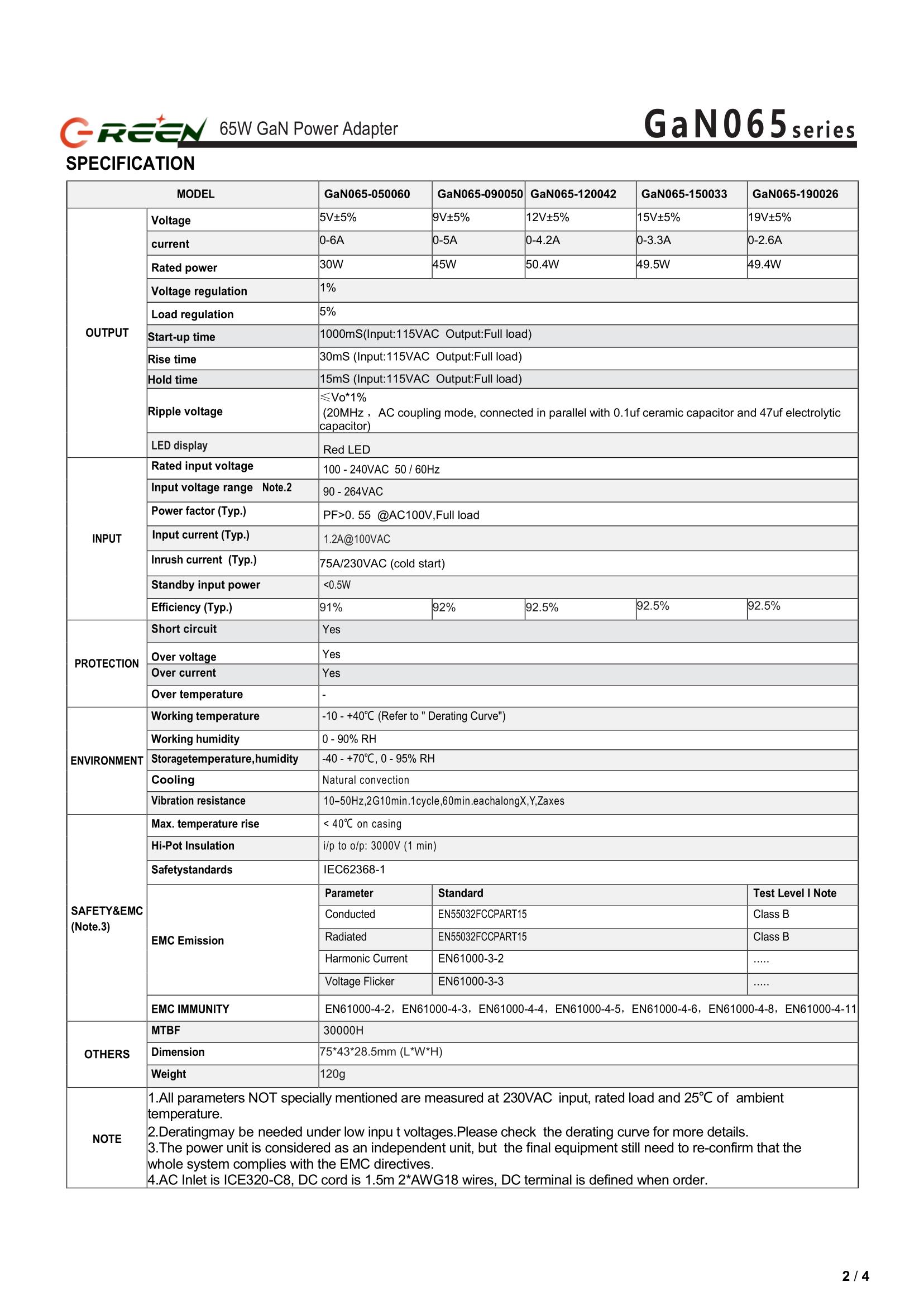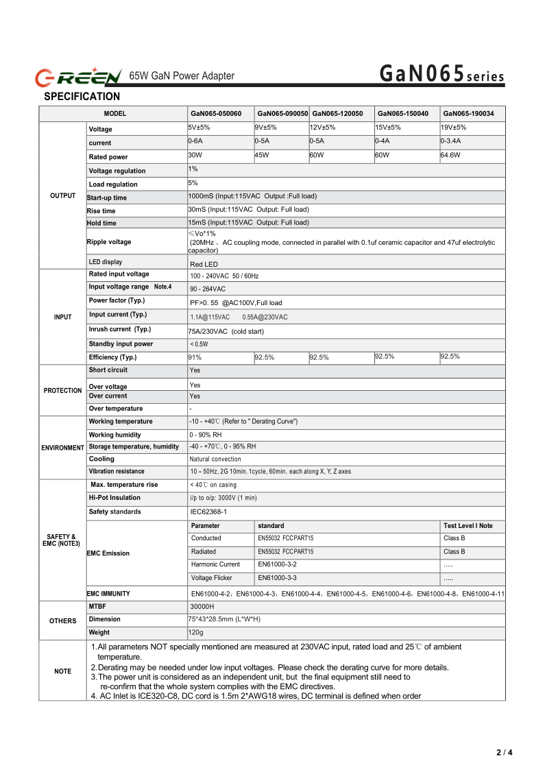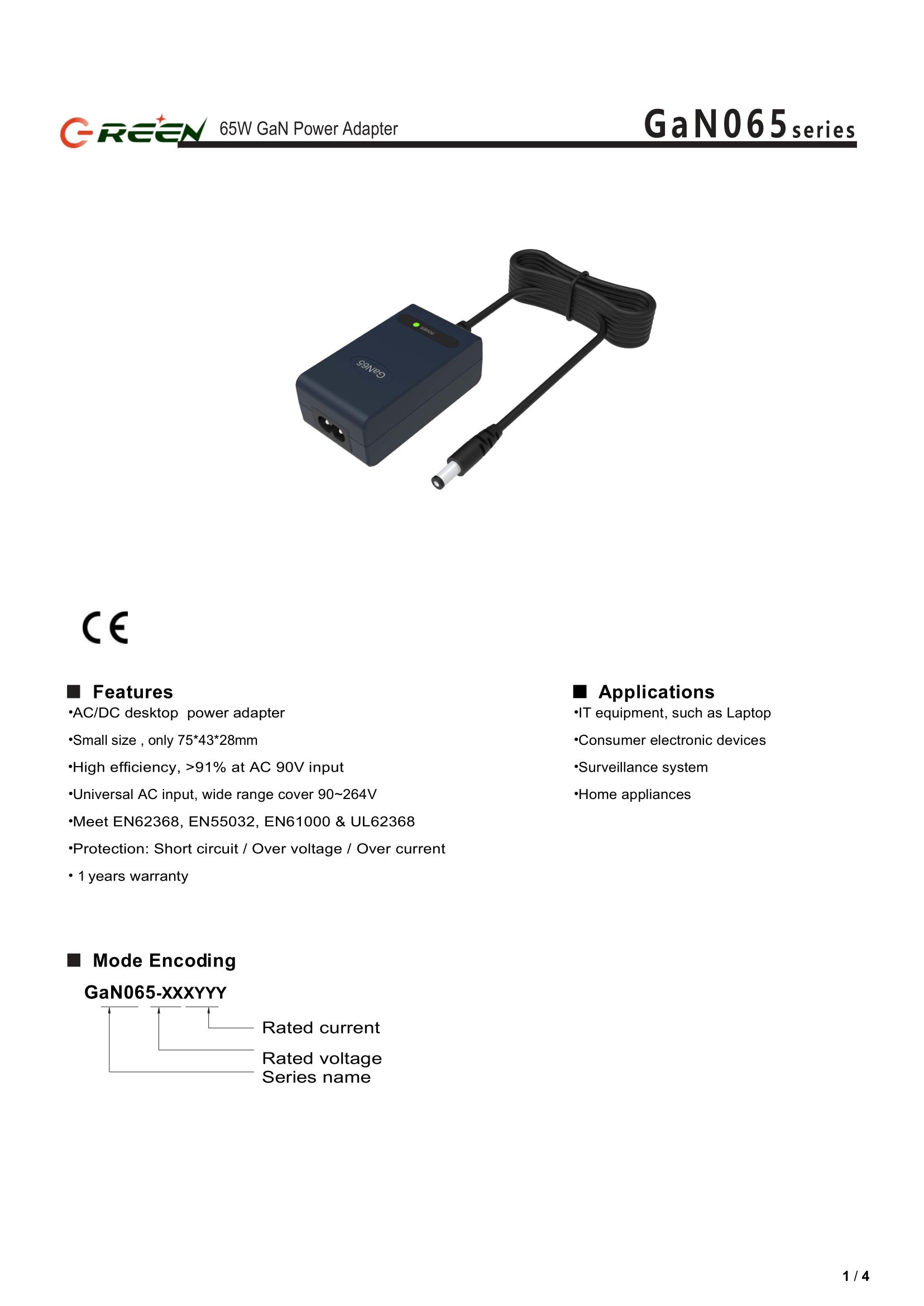 GaN-xy 65W power adapter is a new generation GaN technology high-performance acdc power supply. With GaN + QR + SR new technology, GaN065's power efficiency can reach 94% at AC 100V~240V input range. Output power is 65W, output voltage is 5V~30V, defined in below P/N parameters table. Power factor is as high as 0.98. The size of this 65W power supply is very small, only 5*43*28mm, 1/3 size of traditional acdc adapter. It also features low standby power consumption and low leakage current, making it a very environmentally friendly power adapter.
