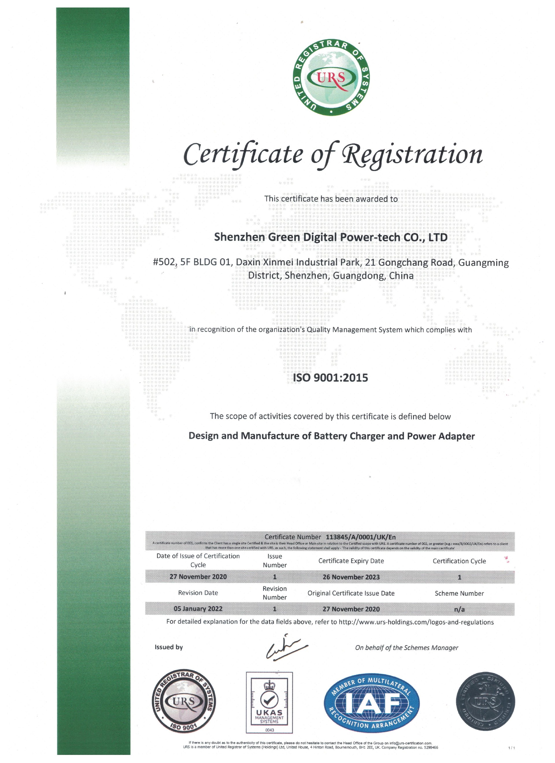 Shenzhen Green Digital Power Tech has passed ISO9001 Certification for power supply and battery charger product. We design, build and service our customer with completely satisfied ISO9001 standards.