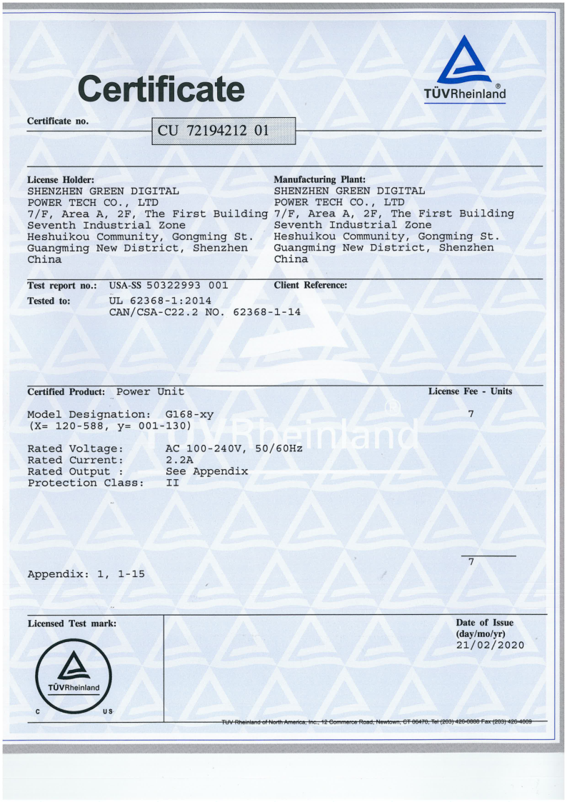 Shenzhen Green Digital Power Tech Co. Ltd SMPS and charger products has passed cTUVus certification, for US and Canad marketing.