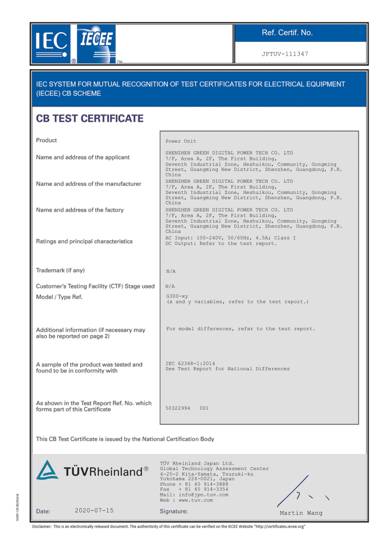 Shenzhen Green Digital Power Tech Co. Ltd SMPS and charger products has International CB test report for power supply & charger